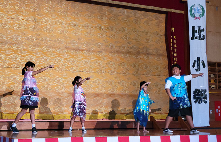 台風26号が島を横断した直後の2025年11月15日、この子たち4人が主役の発表会が行われました。伝統芸能の豊年祭の踊りを皮切りに、ポップなダンスや楽器の演奏、一人ずつの学習発表に4人が揃って島太鼓を響かせるクライマックスに至るまで、衣装を6回着替え、8演目をこなし、拍手喝采を浴びたのです。舞台が設営された体育館にはお年寄りをはじめ地域の人たちが大勢集まり、4人の小さなスターに熱い視線を送ったのでした。