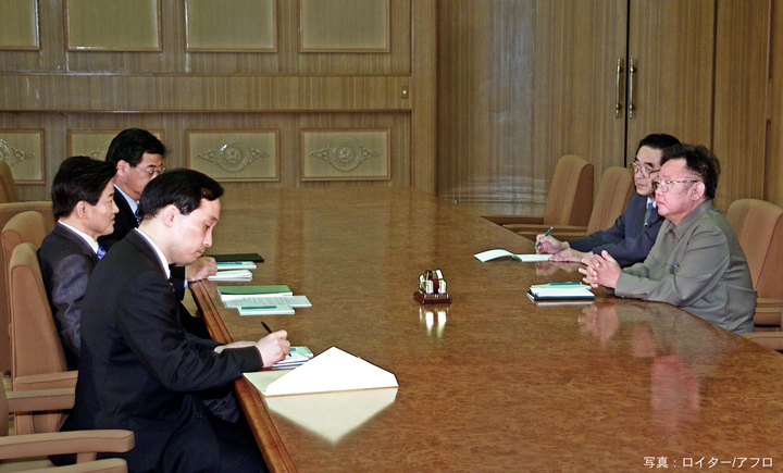 平壌で北朝鮮の金正日総書記(右)と会談する韓国の鄭東泳統一部長官(左側中央)。(2005年6月17日)