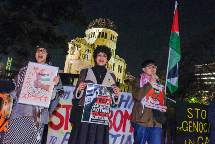 原爆ドーム前で反戦アピールをするシャハッドさんと地元の平和運動家。筆者撮影