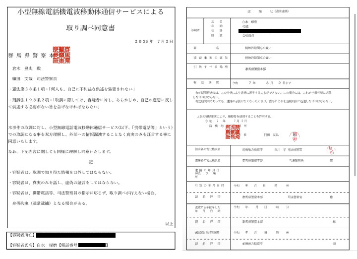 「織田刑事」から送られてきた「取り調べ同意書」と「逮捕状」(著者提供。一部加工)
