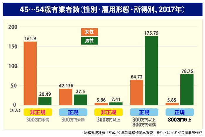 「この数年、均等法第一世代を含む35歳から64歳のことを『ミドル期』と区分して分析しているのですが、たとえば東京23区は、全国でもっともミドル期のひとり暮らしの男女が多い大都市です。しかし所得格差が大きく、特に女性のなかには、不安定で低賃金の仕事に従事している例が少なくありません。家庭と労働の両方から“排除”された女性たちといえるのではないでしょうか。近い将来、非婚・離別でひとり暮らしする高齢女性が確実に増加すると思います」