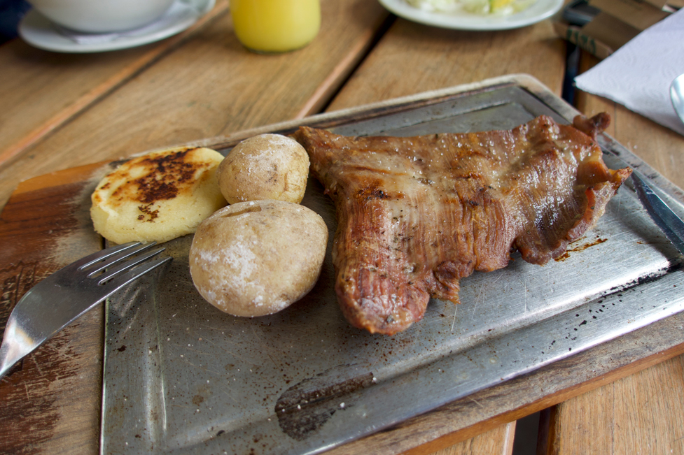 アレパ(とうもろこしのパン)とパパ・ネバーダと豚肉 撮影:篠田有史