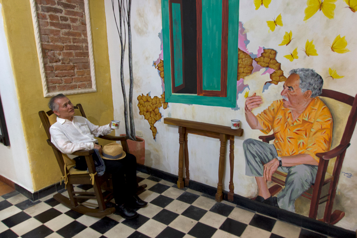 白い花をつけたプルメリアの華奢な木が目立つ背後に間口の狭い入り口があり、宿泊客でなくても、コロンビア出身のノーベル賞作家ゆかりのホテル目当てに人々が訪れる。そんな人々のために、少額の入場料をキーホルダー代として徴収し、見学できるようにしている。足を踏み入れると、数々の見覚えのある写真や、壁に描かれた黄色い蝶の群れの絵などが目に飛び込んでくる。少しやりすぎという感じはするが、それもカリブの人たちの特徴なのだろう。サービス精神が過剰なのだ。それを物語るエピソードをいくつか紹介しよう。