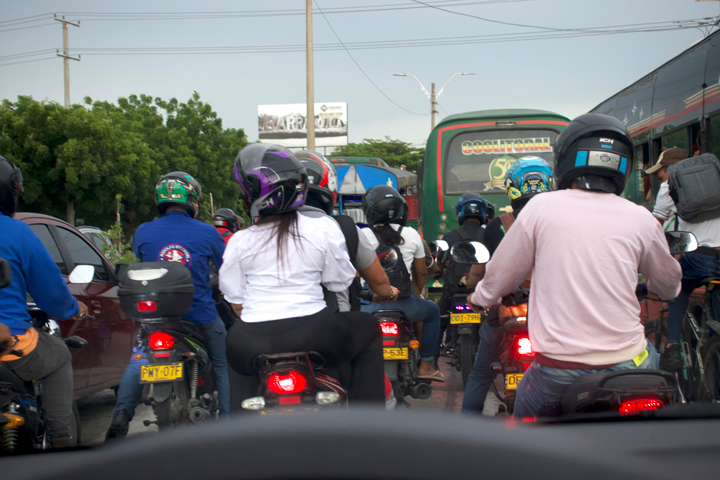 実は、前日の夕方、このホテルを訪ねようとして車でこの下町を訪れていた。午後の5時はバス・オートバイ・乗用車・人が入り乱れる大渋滞だった。路肩には、茅葺屋根の荷台に大きなアボカドやココナッツ、バナナ、オレンジ、パパイヤなどを山積みにした業者が来ているので、その周囲に人が買い物に集まっていたりして、混沌は活気に満ちていた。乗合バスの運転手が、この渋滞を利用して運転席の窓から馴染みらしき露店商に声を掛け、車をノロノロ走らせながら買い物をしていた。そのうちいつしか袋小路のようになっている場所に入り込んでしまった。本当はその先に目当てのホテルはあったはずなのだが、だんだん暗くなっていくし、スマートフォンのナビもこの混雑ぶりは伝えてくれなかった。ホテル・サン・ニコラス・コロニアル探しは一旦あきらめて、翌日の明るいうちにまた来ることにした。そして、日没前に訪れるべきもう一つの場所、マグダレナ川に向かった。