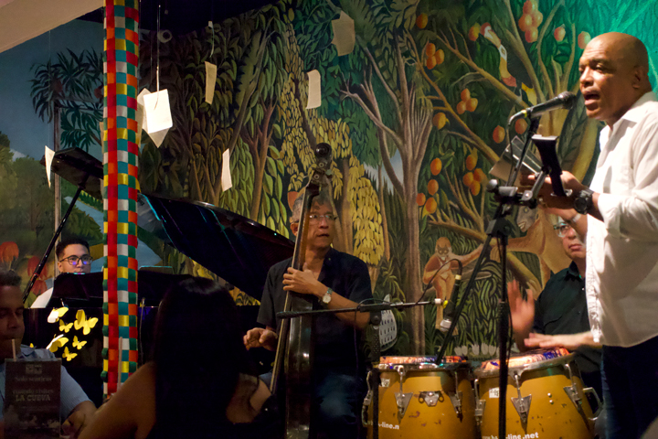 店内にはステージがあり、ステージの背後はアンリ・ルソー風の壁画になっている。テーブルには花やキャンドルではなく、さまざまな獣の被り物が置かれているのも印象的だった。これはバランキージャのカーニバルを連想させる仕掛けだ。ステージのピアノにも黄色い蝶の群れが飾られていた。こちらをその気にさせる演出が心憎い。それならば、と向こうのテーブルの客が飲んでいる、いかにもという黄色いカクテルを注文した。黄色のカクテルは甘く、予想どおり、ドライフルーツの蝶をあしらった飾りが付いていた。この地域のノリがだんだんわかってきた。味付けの濃い魚や肉、ソーセージ、それに必ず付いてくるパタコンつまり潰した青バナナの素揚げが山盛りの大皿と格闘していると、バンドの演奏が始まった。