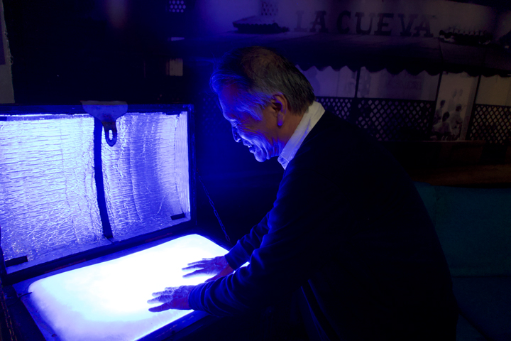 店内に置かれた青白く光る箱 撮影:篠田有史