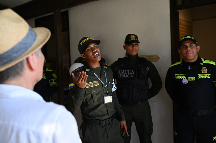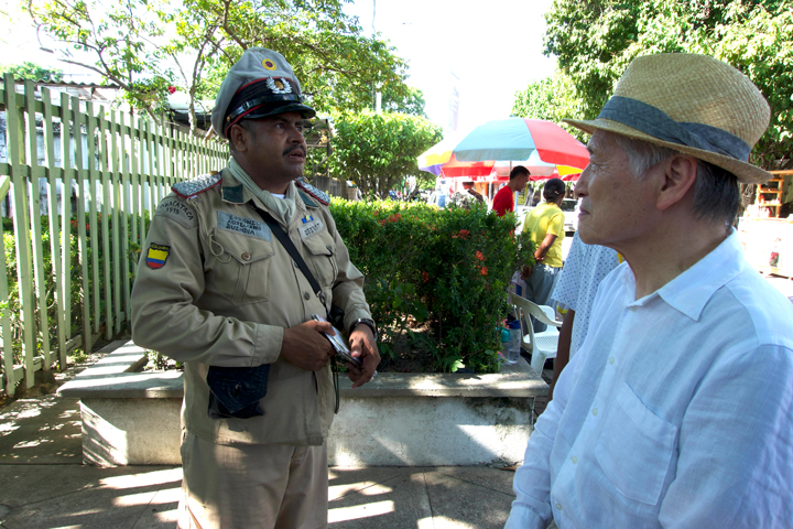ゆっくり見て回ったが、そろそろ喉の渇きと足の疲れを感じ始めたので、見学を切り上げようと言いかけたとき、モスグリーン色の物々しい制服に身を包んだ集団がこちらに向かってきた。何事かと一瞬ひるんだが、威圧感こそあるものの、近づいてくる彼らの口元から白い歯がこぼれている。しかもギターを弾いていたり、赤い風船を持っていたりするのが妙だと思ったら、なんとコロンビア国家警察だった。僕たちの前でとまって歌をうたい出したのでリクエストしてみると、バジェナート(コロンビアの民衆歌謡)を披露してくれた。名曲「ハイメ・モリーナ」だ。若い警察官が声を張り上げて歌う。彼はどうやらこの曲が好きらしい。歌声にとても感情がこもっている。しかも感情が溢れすぎてしばしば音程が外れてしまう。それがなんとも微笑ましかった。「ハイメ・モリーナ」は、バジェナートの作曲家ラファエル・エスカローナによる、亡くなった友人で画家のハイメ・モリーナへの追悼の歌である。だが若い警官は、カルロス・ビベスのカバー・バージョンでこの歌を知ったのかもしれない。