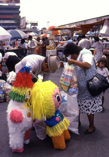 露店街で有名な地域、テピート。ここでは、中にお菓子を入れて叩き割って楽しむパーティ用のピニャータ(手前の紙製の人形)や衣料、日用雑貨など、何でも安く手に入る。(1993年)撮影:篠田有史