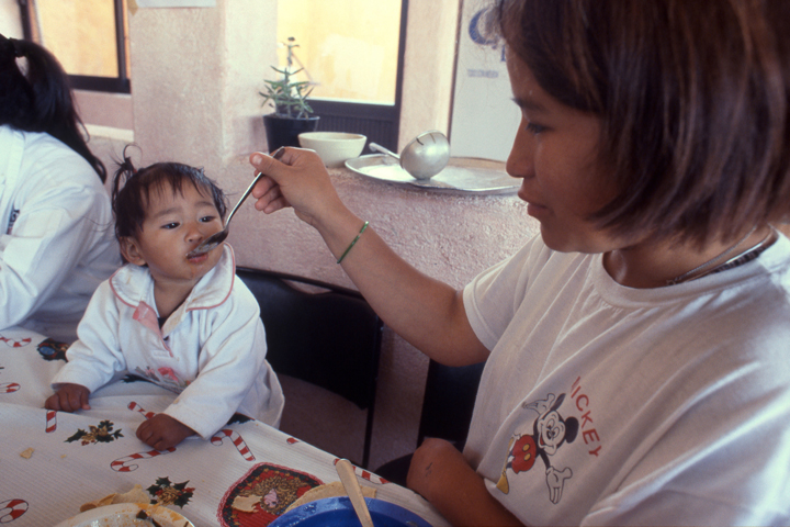 食堂での食事時間。大勢の母子に混じって、オルガも母親の眼差しで、アナベレンにスプーンで一口ずつ食べさせる 撮影:篠田有史
