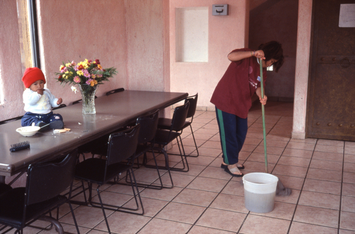 オルガが食堂の掃除当番の日。娘アナベレンは、食べ物や花瓶と一緒に、テーブルの上に載せられていた 撮影:篠田有史