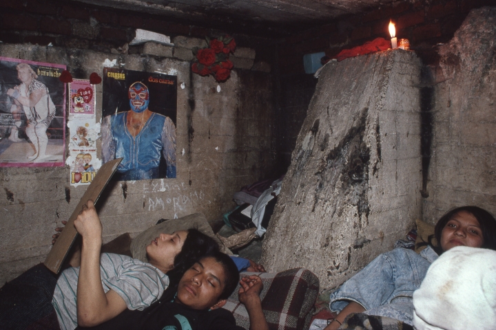 メキシコシティの旧市街にある廃ビル1階の床下空間をねぐらとする子どもたち。50人近い集団で、自らを「ロス・オルビダードス(忘れられた者たち)」と呼び、暮らしていた。(1992年)写真:篠田有史