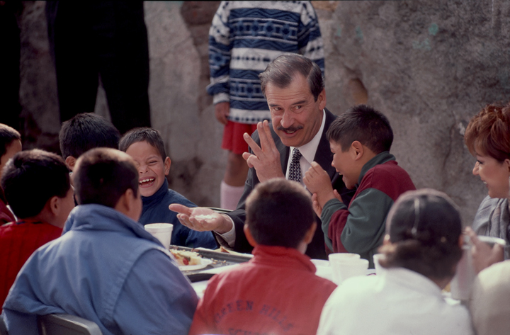 フォックス大統領(2000〜06年)は、自らが資金提供を約束してできたパン工房のオープニングに現れ、できあがったパンを子どもたちと共に試食した。(2001年)撮影:篠田有史