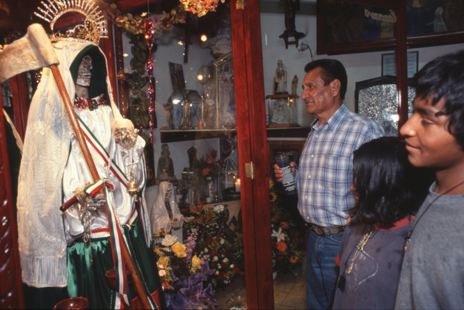 ここで月に2回行われるミサには、1500人を超える信者が集まるという。カルロスが、「麻薬組織のボスなんか、ここにリムジンを乗り付けて、サンタ・ムエルテに大金を捧げるんだよ」と、物知り顔をする。少年も同伴の少女も、この聖女を頼りにしているらしく、彼女の足元に跪(ひざまず)き、しっかりと祈りを捧げた。