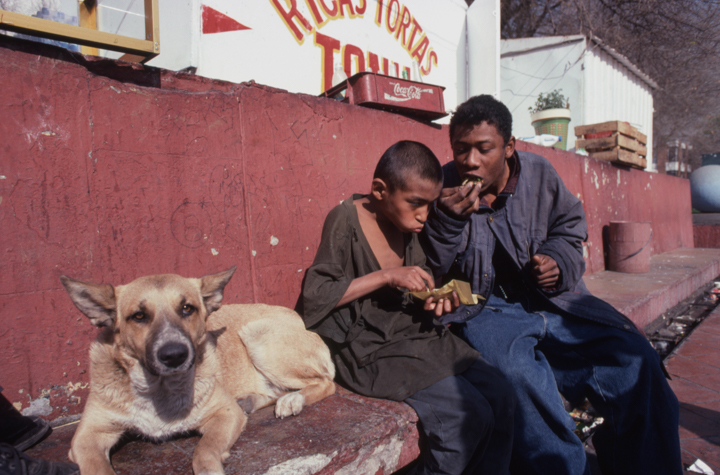 幼い頃、広場のベンチで、仲間と2人、タコスを頬張るカルロス(左)。そばにはいつも犬がいた 撮影:篠田有史