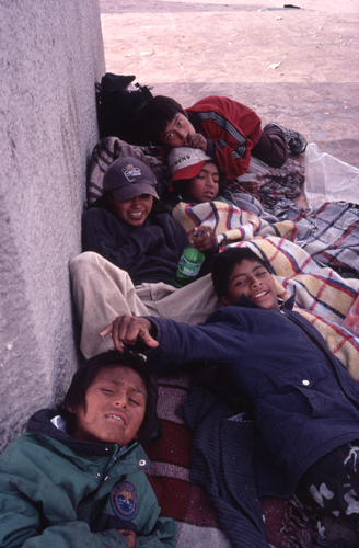 地下鉄駅の上の広場で仲間と生活していたカルロスは、この日、熱を出し、毛布にくるまっていた。2000年末 撮影:篠田有史
