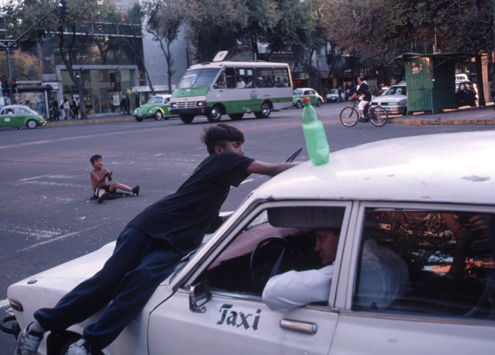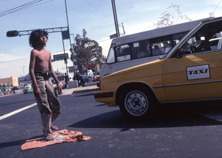 ある日、赤信号の交差点に並ぶ車列の前でこの芸をするカルロスの姿に出くわした。ボサボサ髪の痩せっぽち少年が、上半身裸でニコリともせずに淡々と芸を行う。終わると停車中の車列の間を歩きながら、人差し指を天に掲げてチップを要求。すると、1人、2人、と車の窓を開けて、小銭を差し出してくれる人がいる。この作業を、信号が赤に変わるたびに繰り返した。しゃれた言い方をすれば、一種のパフォーマンス。だが、子どもがやっているのを目にするのは、とにかく痛々しい。