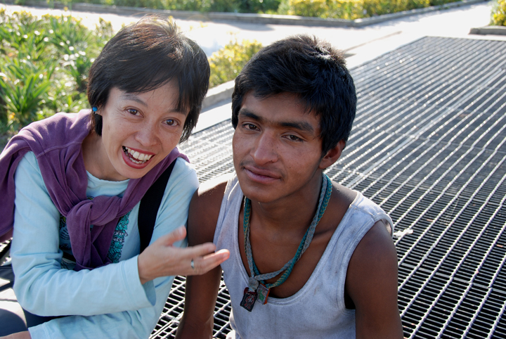 死の聖女のネックレイスを首にかけたカルロスと筆者(左)は、これから散歩に 撮影:篠田有史