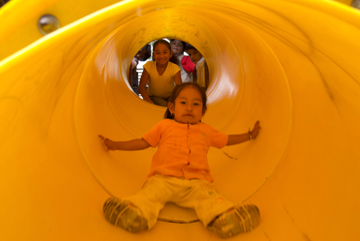 散歩中に見つけた公園で滑り台をするオルガの次女モニカ(手前)と長女アナベレン(奥)2008年 撮影:篠田有史