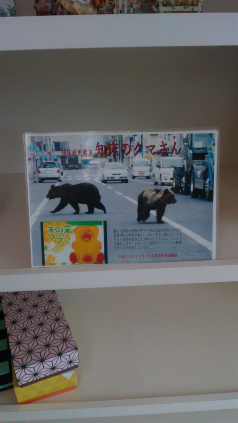 店に入ると、まず飛び込んできたのがクマの写真だった。さっき定食を食べた居酒屋らへんを、クマが歩いている写真。知床といえば、というくらいだからそりゃそうだろう、とは思うが、ビクッとした。写真をようく見ると、知床のクマさん、と書いてあり、そういうお菓子が売っているようだ。それを購入し、店の方の話を聞き、外へ出た。