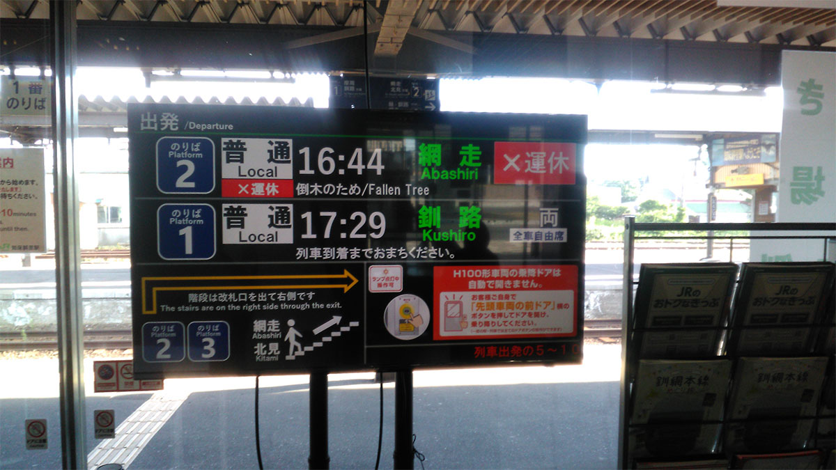 駅へ着き、切符を買おうとすると、まさかの「運休」の文字。乗ろうとしていた16時44分発網走行きが、倒木のため運休と書いてある。次の列車まで2時間20分。その列車も確実に走るかどうか分からない、とのこと。これは困った。少し焦った。駅の隣にあるバスセンターへ行く。網走へ行くバスはありますか。ないですね。困った。網走のスナック「花束」に行きたいのだ。確認しに行きたいのだ。(第28回「彼の地」を参照下さい)