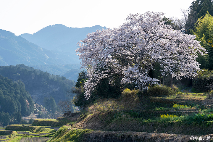 見晴らしの良い場所に立つエドヒガンの古木、仰木の棚田ザクラ。(撮影:今森元希)