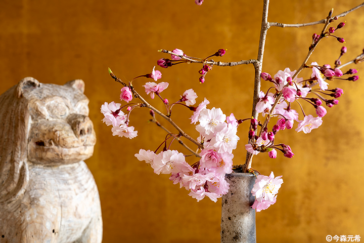 枝垂れ桜の小枝を花瓶に飾ると、部屋に本格的な春がやってくる。(撮影:今森元希)