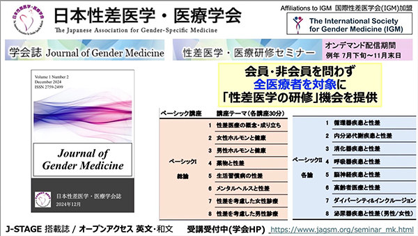 日本性差医学・医療学会はさまざまに活動しています。まず、2021年度から「性差医学・医療認定制度」を開始しました(「日本性差医学・医療認定制度のご案内」)。性差医学・医療認定医・認定指導士のリストも公開していますが、認定者の数は年々増加しています。また、同学会では会員・非会員を問わず、医療者と研究者に向けた性差医学・医療セミナーをオンデマンドで毎年7〜11月に実施しています。また、2024年1月に誰でもアクセスできる学会誌「Journal of Gender Medicine」を創刊しました。性差医療の視点は、医療の質をより高め、診療精度の向上に貢献します。一人でも多くの医療者や研究者に、性差医学の知識を学んでいただけたらと願っています。